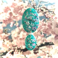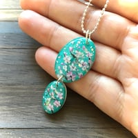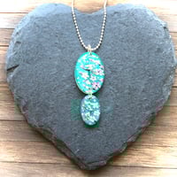 This pendant features an array of blossom set against a stunning shimmering turquoise background. Tiny flecks of glitter add some extra sparkle to catch the light.