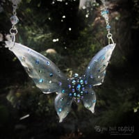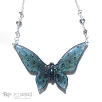 This large butterfly features a colour shift pearlescent effect in blue/green shades. The wings are embellished with complimenting shades of Swarovski crystals and shimmer powder.